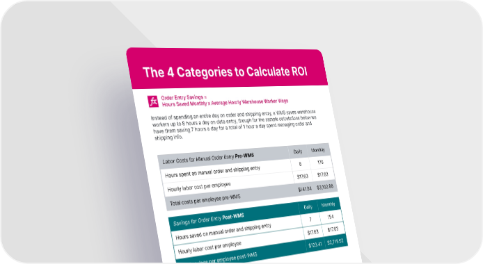 The 4 Categories to Calculate ROI Order Entry Savings = Hours Saved Monthly x Average Hourly Warehouse Worker Wage Instead of spending an entire day on order and shipping entry, a WMS saves warehouse workers up to 8 hours a day on data entry, though for the sample calculations below we have them saving 7 hours a day for a total of 1 hour a day spent managing order and shipping info. extensiv.com | 833.983.6748 8