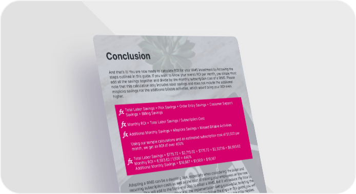 Conclusion And that’s it! You are now ready to calculate ROI for your WMS investment by following the steps outlined in this guide. If you want to know your overall ROI per month, you simply must add all the savings together and divide by the monthly subscription cost of a WMS. Please note that this calculation only includes labor savings and does not include the additional mispicks savings nor the additional billable activities, which would bring your ROI even higher. Total Labor Savings = Pick Savings + Order Entry Savings + Customer Support Savings + Billing Savings Monthly ROI = Total Labor Savings / Subscription Cost Additional Monthly Savings = Mispicks Savings + Missed Billable Activities Using our sample calculations and an estimated subscription cost of $1,500 per month, we get an ROI of over 400% Total Labor Savings = $775.72 + $2,715.02 + $775.72 + $2,327.16 = $6,593.62 Monthly ROI = 6,593.62 / 1,500 = 440% Additional Monthly Savings = $16,667 + $1,500 = $18,167 Adopting a WMS can be a daunting task, especially when considering the initial and recurring subscription costs as well as the cost of training your employees on the new system. This will add to the front-end cost to adopt a WMS, but it will reduce the time to implement and increase the chance of the implementation being successful, boosting the efficacy of your workflows with the WMS. But, if you follow the steps in this guide, you will see that the ROI for adopting a WMS is well worth the investment after the initial hurdles. extensiv.com | 833.983.6748 13