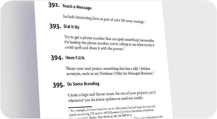 FUN FOR OTHERS 392. Teach a Message 1 Include interesting facts as part of your IM away message. 393. Dial It Up Try to get a phone number that can spell something memorable. Or lookup the phone number you’re calling to see what words it could spell and share it with the person.2 394. Have F.U.N. Name your next project something that has a silly / hidden acronym, such as my Database Utility for Managed Business.3 395. Do Some Branding Create a logo and theme music for one of your projects; use it whenever you do status updates or send out emails. 1 For example, did you know that nerve cells create electrical impulses that reach speeds exceeding 270 miles (~430 kilometers) per hour? See Bodies Exhibition. 2 You can reach Humor That Works at 646-54-DREW-8. 3 Or you can join ACRONIM: the Acronym Cessation and Resistance Organization for Non–Idiomatic Messages 200