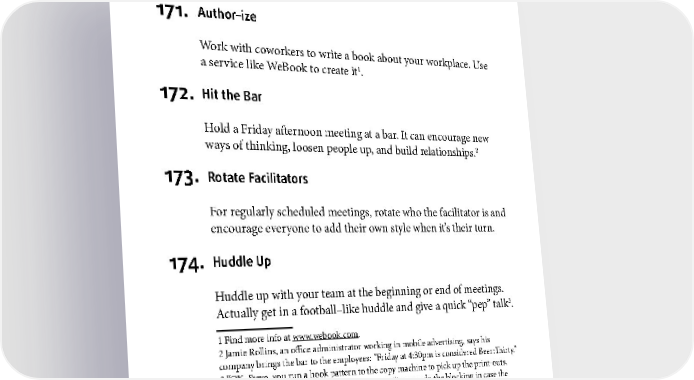 TEAM BUILDING 171. Author–ize Work with coworkers to write a book about your workplace. Use 1 a service like WeBook to create it . 172. Hit the Bar Hold a Friday afternoon meeting at a bar. It can encourage new ways of thinking, loosen people up, and build relationships.2 173. Rotate Facilitators For regularly scheduled meetings, rotate who the facilitator is and encourage everyone to add their own style when it’s their turn. 174. Huddle Up Huddle up with your team at the beginning or end of meetings. 3 Actually get in a football–like huddle and give a quick “pep” talk . 1 Find more info at www.webook.com. 2 Jamie Rollins, an office administrator working in mobile advertising, says his company brings the bar to the employees: “Friday at 4:30pm is considered Beer:Thirty.” 3 “OK, Steve, you run a hook pattern to the copy machine to pick up the print-outs. Sarah, you run a slant to book the boardroom. Tim, you do the blocking in case the project board calls a blitz of scope creep. Alright, break!” 94