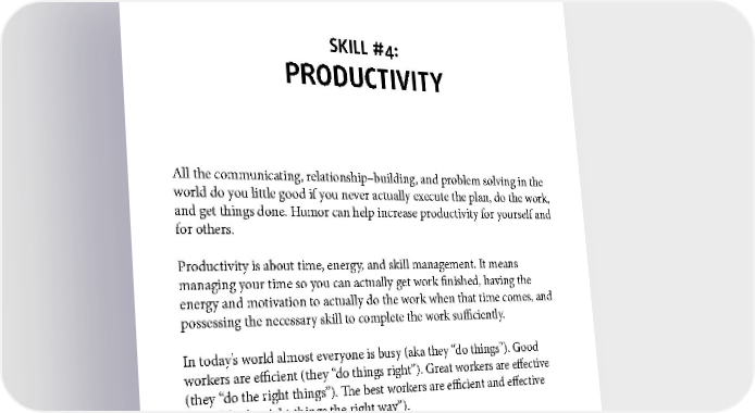 SKILL #4: PRODUCTIVITY All the communicating, relationship–building, and problem solving in the world do you little good if you never actually execute the plan, do the work, and get things done. Humor can help increase productivity for yourself and for others. Productivity is about time, energy, and skill management. It means managing your time so you can actually get work finished, having the energy and motivation to actually do the work when that time comes, and possessing the necessary skill to complete the work sufficiently. In today’s world almost everyone is busy (aka they “do things”). Good workers are efficient (they “do things right”). Great workers are effective (they “do the right things”). The best workers are efficient and effective (they “do the right things the right way”). 155