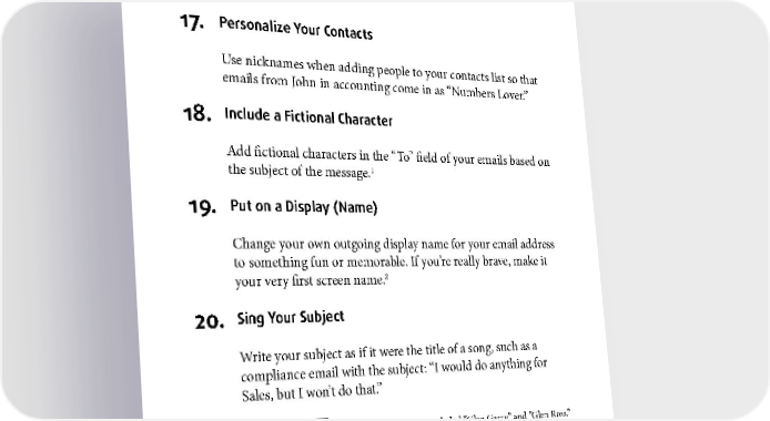 EMAIL 17. Personalize Your Contacts Use nicknames when adding people to your contacts list so that emails from John in accounting come in as “Numbers Lover.” 18. Include a Fictional Character Add fictional characters in the “To” field of your emails based on 1 the subject of the message. 19. Put on a Display (Name) Change your own outgoing display name for your email address to something fun or memorable. If you’re really brave, make it your very first screen name.2 20. Sing Your Subject Write your subject as if it were the title of a song, such as a compliance email with the subject: “I would do anything for Sales, but I won’t do that.” 1 I was once on an email to a sales group that included “Glen Garry” and “Glen Ross.” 2 This message brought to you by: skilz4ever. Yes, that was my actual screen name. 24