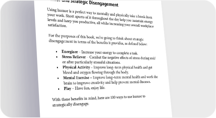 STRATEGIC DISENGAGEMENT Humor and Strategic Disengagement Using humor is a perfect way to mentally and physically take a break from your work. Short spurts of it throughout the day help you maintain energy levels and keep you productive, all while increasing your overall workplace satisfaction. For the purposes of this book, we’re going to think about strategic disengagement in terms of the benefits it provides, as defined below: • Energizer – Increase your energy to complete a task. • Stress Reliever – Combat the negative effects of stress during and/ or after particularly stressful situations. • Physical Activity – Improve long–term physical health and get blood and oxygen flowing through the body. • Mental Exercise – Improve long–term mental health and work the brain to improve creativity and help prevent mental diseases. • Play – Have fun, enjoy life. With these benefits in mind, here are 100 ways to use humor to strategically disengage. 205