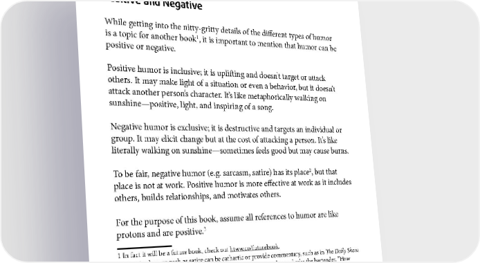 HUMOR THAT WORKS Positive and Negative While getting into the nitty-gritty details of the different types of humor is a topic for another book1, it is important to mention that humor can be positive or negative. Positive humor is inclusive; it is uplifting and doesn’t target or attack others. It may make light of a situation or even a behavior, but it doesn’t attack another person’s character. It’s like metaphorically walking on sunshine—positive, light, and inspiring of a song. Negative humor is exclusive; it is destructive and targets an individual or group. It may elicit change but at the cost of attacking a person. It’s like literally walking on sunshine—sometimes feels good but may cause burns. To be fair, negative humor (e.g. sarcasm, satire) has its place2, but that place is not at work. Positive humor is more effective at work as it includes others, builds relationships, and motivates others. For the purpose of this book, assume all references to humor are like 3 protons and are positive. 1 In fact it will be a future book, check out htww.co/futurebook. 2 Negative humor such as satire can be cathartic or provide commentary, such as in The Daily Show. 3 Which reminds me of a classic joke: A neutron walks into a bar and asks the bartender, “How much for a drink?” The bartender replies, “For you, no charge.” 3