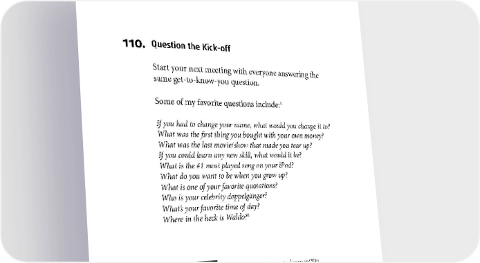 ICEBREAKERS 110. Question the Kick-off Start your next meeting with everyone answering the same get-to-know-you question. 1 Some of my favorite questions include: If you had to change your name, what would you change it to? What was the first thing you bought with your own money? What was the last movie/show that made you tear up? If you could learn any new skill, what would it be? What is the #1 most played song on your iPod? What do you want to be when you grow up? What is one of your favorite quotations? Who is your celebrity doppelgänger? What’s your favorite time of day? 2 Where in the heck is Waldo? 1 If you want a list of 50 awesome questions, go to htww.co/50q. 2 I have no clue where he is, but did you notice the paragraph shape? See #82. 66