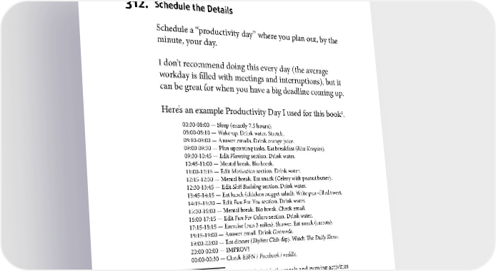 PLANNING 312. Schedule the Details Schedule a “productivity day” where you plan out, by the minute, your day. I don’t recommend doing this every day (the average workday is filled with meetings and interruptions), but it can be great for when you have a big deadline coming up. Here’s an example Productivity Day I used for this book1. 00:30-08:00 — Sleep (exactly 7.5 hours). 08:00-08:10 — Wake up. Drink water. Stretch. 08:10-09:00 — Answer emails. Drink orange juice. 09:00-09:30 — Plan upcoming tasks. Eat breakfast (Rice Krispies). 09:30-10:45 — Edit Planning section. Drink water. 10:45-11:00 — Mental break. Bio break. 11:00-12:15 — Edit Motivation section. Drink water. 12:15-12:30 — Mental break. Eat snack (Celery with peanut butter). 12:30-13:45 — Edit Skill Building section. Drink water. 13:45-14:15 — Eat lunch (chicken nugget salad). Write pun–filled tweet. 14:15-15:30 — Edit Fun For You section. Drink water. 15:30-16:00 — Mental break. Bio break. Check email. 16:00-17:15 — Edit Fun For Others section. Drink water. 17:15-18:15 — Exercise (run 3 miles). Shower. Eat snack (carrots). 18:15-19:00 — Answer email. Drink Gatorade. 19:00-20:00 — Eat dinner (Skyline Chili dip). Watch The Daily Show. 20:00-00:00 — IMPROV! 00:00-00:30 — Check ESPN / Facebook / reddit. 1 I did almost this exact schedule (with the meals and evening activities changing) for a week to finish round three of edits for the entire book. 164