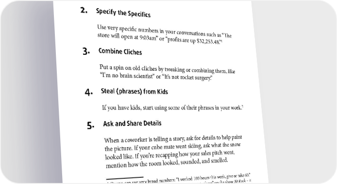CONVERSATION 2. Specify the Specifics Use very specific numbers in your conversations such as “The 1 store will open at 9:03am” or “profits are up $32,253.48.” 3. Combine Cliches Put a spin on old cliches by tweaking or combining them, like “I’m no brain scientist” or “It’s not rocket surgery.” 4. Steal (phrases) from Kids 2 If you have kids, start using some of their phrases in your work. 5. Ask and Share Details When a coworker is telling a story, ask for details to help paint the picture. If your cube mate went skiing, ask what the snow looked like. If you’re recapping how your sales pitch went, mention how the room looked, sounded, and smelled. 1 Or you can use very broad numbers: “I worked 100 hours this week, give or take 60.” 2 This is where Tina Fey got the phrase “I want to go to there” on the show 30 Rock – it was something her daughter said. 17