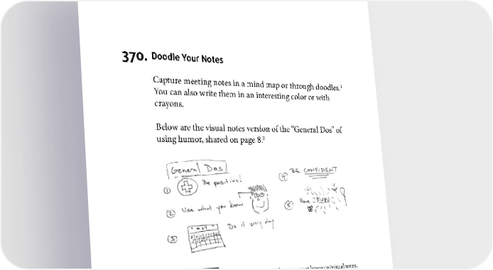FUN FOR YOU 370. Doodle Your Notes 1 Capture meeting notes in a mind map or through doodles. You can also write them in an interesting color or with crayons. Below are the visual notes version of the “General Dos” of 2 using humor, shared on page 8. 1 This is known as “visual note–taking.” Find out more at htww.co/visualnotes. 2 As you can see, it doesn’t require you to be a great artist. Just draw! 189