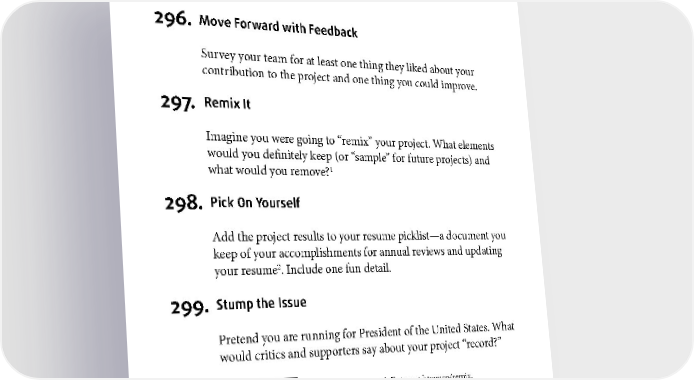 EVALUATION 296. Move Forward with Feedback Survey your team for at least one thing they liked about your contribution to the project and one thing you could improve. 297. Remix It Imagine you were going to “remix” your project. What elements would you definitely keep (or “sample” for future projects) and 1 what would you remove? 298. Pick On Yourself Add the project results to your resume picklist—a document you keep of your accomplishments for annual reviews and updating 2 your resume . Include one fun detail. 299. Stump the Issue Pretend you are running for President of the United States. What would critics and supporters say about your project “record?” 1 Get inspired by some of the best remixes of all time at htww.co/remix. 2 You do have an “accomplishments picklist” right? 153