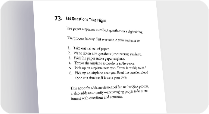 TRAINING 73. Let Questions Take Flight Use paper airplanes to collect questions in a big training. The process is easy. Tell everyone in your audience to: 1. Take out a sheet of paper. 2. Write down any questions (or concerns) you have. 3. Fold the paper into a paper airplane. 4. Throw the airplane somewhere in the room. 1 5. Pick up an airplane near you. Throw it or skip to #6. 6. Pick up an airplane near you. Read the question aloud (one at a time) as if it were your own. This not only adds an element of fun to the Q&A process, it also adds anonymity—encouraging people to be more honest with questions and concerns. 1 You can repeat this step as many times as your heart desires. 46