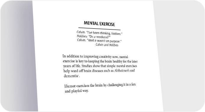 MENTAL EXERCISE Calvin: “I’ve been thinking, Hobbes.” Hobbes: “On a weekend?” Calvin: “Well it wasn’t on purpose.” - Calvin and Hobbes In addition to improving creativity now, mental exercise is key to keeping the brain healthy for the later years of life. Studies show that simple mental exercises help ward off brain diseases such as Alzheimer’s and 1 dementia . Humor exercises the brain by challenging it in a fun and playful way. 1 See Using the Brain. 232