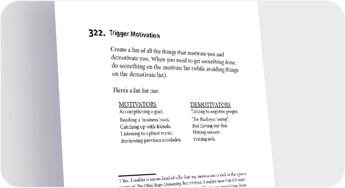 MOTIVATION 322. Trigger Motivation Create a list of all the things that motivate you and demotivate you. When you need to get something done, do something on the motivate list (while avoiding things on the demotivate list). Here’s a list for me: MOTIVATORS DEMOTIVATORS Accomplishing a goal. Talking to negative people. 1 Reading a business book. The Buckeyes losing . Catching up with friends. Not having any fun. Listening to upbeat music. Hitting snooze. Reviewing previous accolades. Feeling sick. 1 Yes, I realize it seems kind of silly that my motivation is tied to the sports teams of The Ohio State University, but it’s true. I realize now that if I want to be productive on the day the Buckeyes play, I better get everything done before I watch the game or look at the score. 169