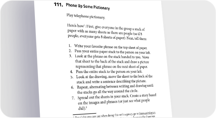 ICEBREAKERS 111. Phone Up Some Pictionary Play telephone pictionary. 1 Here’s how : First, give everyone in the group a stack of paper with as many sheets as there are people (so if 8 people, everyone gets 8 sheets of paper). Next, tell them: 1. Write your favorite phrase on the top sheet of paper. 2. Pass your entire paper stack to the person on your left. 3. Look at the phrase on the stack handed to you. Move that sheet to the back of the stack and draw a picture representing that phrase on the next sheet of paper. 4. Pass the entire stack to the person on your left. 5. Look at the drawing, move the sheet to the back of the stack and write a sentence describing the picture. 6. Repeat, alternating between writing and drawing until the stacks go all the way around the circle. 7. Spread out the sheets in your stack. Create a story based on the images and phrases (or just see what people did).2 1 For slides you can use when doing this with a group, go to htww.co/telepict. 2 You can also encourage people to write their names down on the drawings they do. This creates a “business card” the participants can take with them. 67