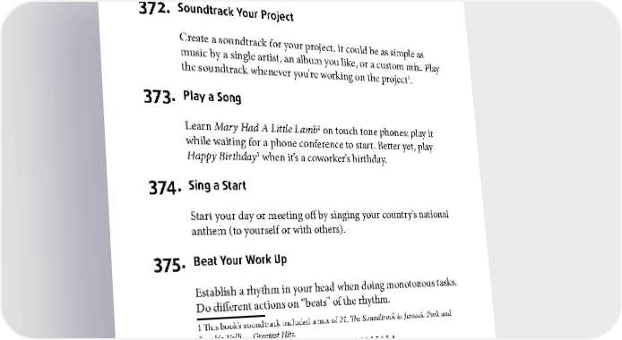 FUN FOR YOU 372. Soundtrack Your Project Create a soundtrack for your project. It could be as simple as music by a single artist, an album you like, or a custom mix. Play the soundtrack whenever you’re working on the project1. 373. Play a Song 2 Learn Mary Had A Little Lamb on touch tone phones; play it while waiting for a phone conference to start. Better yet, play Happy Birthday3 when it’s a coworker’s birthday. 374. Sing a Start Start your day or meeting off by singing your country’s national anthem (to yourself or with others). 375. Beat Your Work Up Establish a rhythm in your head when doing monotonous tasks. Do different actions on “beats” of the rhythm. 1 This book’s soundtrack included a mix of 21, The Soundtrack to Jurassic Park and Frankie Valli — Greatest Hits. 2 The “notes”: 6 5 4 5 6 6 6 5 5 5 6 8 8 / 6 5 4 5 6 6 6 6 5 5 6 5 4. 3 The “notes”: 1 1 2 1 6 3 / 1 1 2 1 9 6 / 1 1 # 9 6 3 2 / # # 9 6 9 6. 191