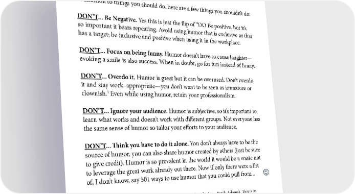 HUMOR THAT WORKS In addition to things you should do, here are a few things you shouldn’t do: DON’T... Be Negative. Yes this is just the flip of “DO Be positive, but it’s so important it bears repeating. Avoid using humor that is exclusive or that has a target; be inclusive and positive when using it in the workplace. DON’T... Focus on being funny. Humor doesn’t have to cause laughter— evoking a smile is also success. When in doubt, go for fun instead of funny. DON’T... Overdo it. Humor is great but it can be overused. Don’t overdo it and stay work–appropriate—you don’t want to be seen as immature or 1 clownish. Even while using humor, retain your professionalism. DON’T... Ignore your audience. Humor is subjective, so it’s important to learn what works and doesn’t work with different groups. Not everyone has the same sense of humor so tailor your efforts to your audience. DON’T... Think you have to do it alone. You don’t always have to be the source of humor, you can also share humor created by others (just be sure to give credit). Humor is so prevalent in the world it would be a waste not to leverage the great work already out there. Now if only there were a list of, I don’t know, say 501 ways to use humor that you could pull from... 1 This isn’t a slight on clowns—they do incredible work (just look up Patch Adams). This is in reference to the stereotype of “clowning around like a fool.” 9