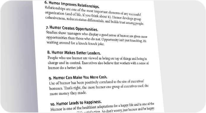 HUMOR THAT WORKS 6. Humor Improves Relationships. Relationships are one of the most important elements of any successful organization (and of life, if you think about it). Humor develops group cohesiveness, reduces status differentials, and builds trust among people. 7. Humor Creates Opportunities. Studies show managers who display a good sense of humor are given more opportunities than those who do not. Opportunity isn’t just knocking, it’s waiting around for a knock-knock joke. 8. Humor Makes Better Leaders. People who use humor are viewed as being on top of things and being in charge and in control. Executives also believe that workers with a sense of humor do a better job. 9. Humor Can Make You More Cash. Use of humor has been positively correlated to the size of executives’ bonuses. That’s right, the more humor one group of executives used, the more money they made. 10. Humor Leads to Happiness. Humor is one of the healthiest adaptations for a happy life and is one of the best predictors of life satisfaction. So don’t worry, just humor and be happy. 7