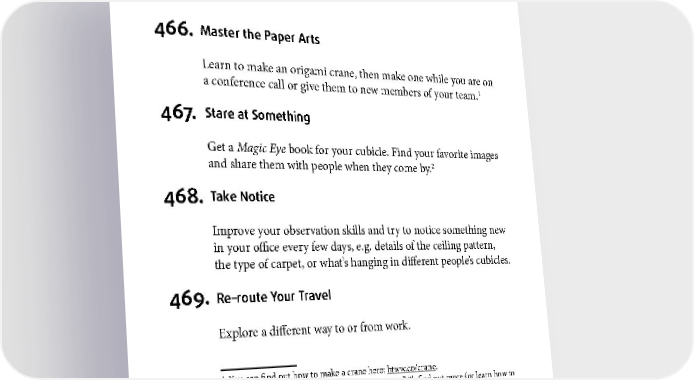 MENTAL EXERCISE 466. Master the Paper Arts Learn to make an origami crane, then make one while you are on 1 a conference call or give them to new members of your team. 467. Stare at Something Get a Magic Eye book for your cubicle. Find your favorite images and share them with people when they come by.2 468. Take Notice Improve your observation skills and try to notice something new in your office every few days, e.g. details of the ceiling pattern, the type of carpet, or what’s hanging in different people’s cubicles. 469. Re–route Your Travel Explore a different way to or from work. 1 You can find out how to make a crane here: htww.co/crane. 2 The official name of these images is “stereogram.” To find out more (or learn how to create your own) check out: htww.co/stereogram. 236