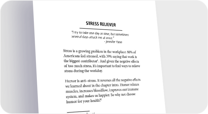 STRESS RELIEVER “I try to take one day at time, but sometimes several days attack me at once.” - Jennifer Yane Stress is a growing problem in the workplace: 80% of Americans feel stressed, with 39% saying that work is 1 the biggest contributor . And given the negative effects of too much stress, it’s important to find ways to relieve stress during the workday. Humor is anti–stress. It reverses all the negative effects we learned about in the chapter intro. Humor relaxes muscles, increases bloodflow, improves our immune system, and makes us happier. So why not choose humor for your health?2 1 See Americans Stressed. 2 See Humor Benefits: Anti-Stress. 214