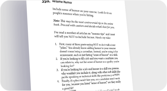 SKILL BUILDING 356. Resume Humor Include sense of humor on your resume. Look for it on people’s resumes when you’re hiring. Note: This may be the most controversial tip in the entire book. Proceed with caution and decide what’s best for you. I’ve read a number of articles on “resume tips” and most will tell you NOT to include humor. Here’s my take: 1. First, many of these posts saying NOT to do it talk about “jokes.” You already know adding humor to your resume doesn’t mean being a comedian. Instead, you’re using it for amusement, such as just listing “sense of humor” as a skill. 2. If you’re looking to fill a job and you want a candidate you can relate to, why not list sense of humor as a quality you’re looking for?1 3. If you’re looking for a job and humor is a skill you possess, why wouldn’t you include it, along with other soft skills like public speaking or technical skills like proficiency at PHP? 4. Finally, if a place won’t hire you, or a candidate won’t work for you, because you listed “sense of humor,” are they really a good fit? 1 I know of more than a few people who included “sense of humor” on job posts and were happy with the results, including the mayor of a major city. 183