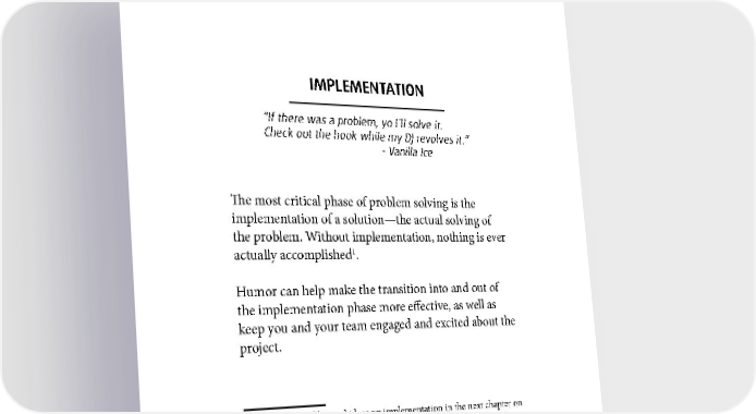 IMPLEMENTATION “If there was a problem, yo I’ll solve it. Check out the hook while my DJ revolves it.” - Vanilla Ice The most critical phase of problem solving is the implementation of a solution—the actual solving of the problem. Without implementation, nothing is ever 1 actually accomplished . Humor can help make the transition into and out of the implementation phase more effective, as well as keep you and your team engaged and excited about the project. 1 You can find additional ideas on implementation in the next chapter on Productivity. This section focuses on those specific to solving a problem. 138