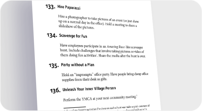 COMMUNITY BUILDING 133. Hire Paparazzi Hire a photographer to take pictures of an event (or just show up on a normal day in the office). Hold a meeting to share a slideshow of the pictures. 134. Scavenge for Fun Have employees participate in an Amazing Race–like scavenger hunt. Include challenges that involve taking pictures or video of 1 them doing fun activities . Share the media after the hunt is over. 135. Party without a Plan Hold an “impromptu” office party. Have people bring cheap office supplies from their desk as gifts. 136. Unleash Your Inner Village Person 2 Perform the YMCA at your next community meeting. 1 One of my favorite activities I’ve done on such a hunt was make a quick commercial for a local business. Not only did we have fun, we also got a free sandwich out of it. 2 Or create a parody of it. I’ve sung versions titled: PSAT, OGSM and DREW. 79