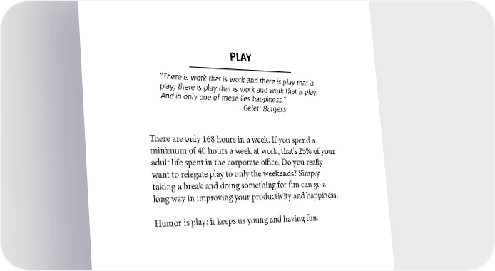 PLAY “There is work that is work and there is play that is play; there is play that is work and work that is play. And in only one of these lies happiness.” - Gelett Burgess There are only 168 hours in a week. If you spend a minimum of 40 hours a week at work, that’s 25% of your adult life spent in the corporate office. Do you really want to relegate play to only the weekends? Simply taking a break and doing something for fun can go a long way in improving your productivity and happiness. Humor is play; it keeps us young and having fun. 242