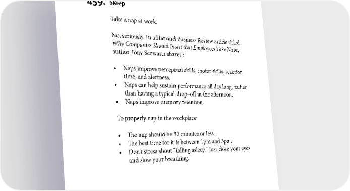 PHYSICAL ACTIVITY 459. Sleep Take a nap at work. No, seriously. In a Harvard Business Review article titled Why Companies Should Insist that Employees Take Naps, 1 author Tony Schwartz shares : • Naps improve perceptual skills, motor skills, reaction time, and alertness. • Naps can help sustain performance all day long, rather than having a typical drop–off in the afternoon. • Naps improve memory retention. To properly nap in the workplace: • The nap should be 30 minutes or less. • The best time for it is between 1pm and 3pm. • Don’t stress about “falling asleep.” Just close your eyes and slow your breathing. 1 See Insist Employees Take Naps. 231