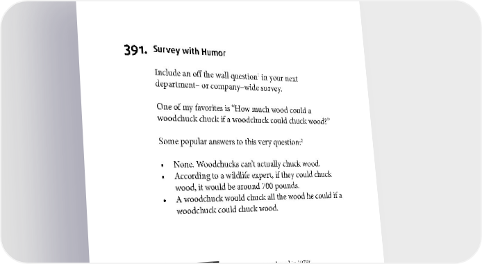 FUN FOR OTHERS 391. Survey with Humor 1 Include an off the wall question in your next department– or company–wide survey. One of my favorites is “How much wood could a woodchuck chuck if a woodchuck could chuck wood?” Some popular answers to this very question:2 • None. Woodchucks can’t actually chuck wood. • According to a wildlife expert, if they could chuck wood, it would be around 700 pounds. • A woodchuck would chuck all the wood he could if a woodchuck could chuck wood. 1 E.g., which Michael Jackson album was released in 1979? 2 See How Much Wood. 199