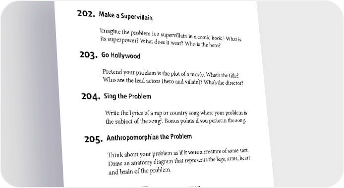 PROBLEM DEFINITION 202. Make a Supervillain Imagine the problem is a supervillain in a comic book.1 What is its superpower? What does it wear? Who is the hero? 203. Go Hollywood Pretend your problem is the plot of a movie. What’s the title? Who are the lead actors (hero and villain)? Who’s the director? 204. Sing the Problem Write the lyrics of a rap or country song where your problem is 2 the subject of the song . Bonus points if you perform the song. 205. Anthropomorphize the Problem Think about your problem as if it were a creature of some sort. Draw an anatomy diagram that represents the legs, arms, heart, and brain of the problem. 1 “Oh no, it’s Shrinking Budget Man. Ahhhhhhh!” 2 Our software is buggy, making it slow. / The customers are jailed, they cannot pass go. 112