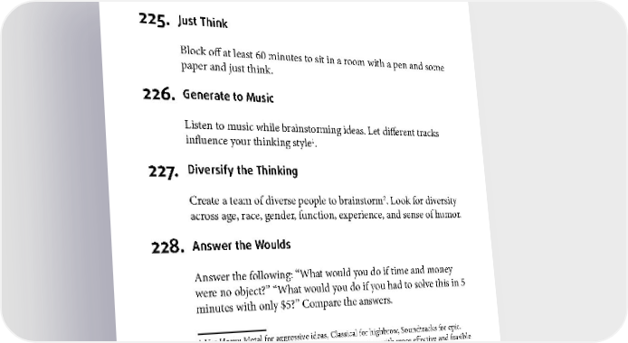 BRAINSTORMING 225. Just Think Block off at least 60 minutes to sit in a room with a pen and some paper and just think. 226. Generate to Music Listen to music while brainstorming ideas. Let different tracks 1 influence your thinking style . 227. Diversify the Thinking 2 Create a team of diverse people to brainstorm . Look for diversity across age, race, gender, function, experience, and sense of humor. 228. Answer the Woulds Answer the following: “What would you do if time and money were no object?” “What would you do if you had to solve this in 5 minutes with only $5?” Compare the answers. 1 Use Heavy Metal for aggressive ideas, Classical for highbrow, Soundtracks for epic. 2 Studies have shown diverse teams are able to come up with more effective and feasible solutions than a homogeneous team. See Diversity and Creativity. 121