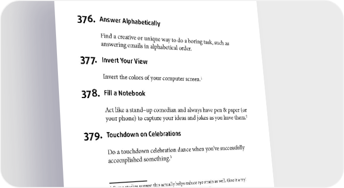FUN FOR YOU 376. Answer Alphabetically Find a creative or unique way to do a boring task, such as answering emails in alphabetical order. 377. Invert Your View 1 Invert the colors of your computer screen. 378. Fill a Notebook Act like a stand–up comedian and always have pen & paper (or your phone) to capture your ideas and jokes as you have them.2 379. Touchdown on Celebrations Do a touchdown celebration dance when you’ve successfully 3 accomplished something. 1 Some studies suggest this actually helps reduce eye strain as well. Give it a try! 2 I personally use Evernote. Check it out at Evernote.com 3 My personal favorite is the Ickey Shuffle. Who Dey! 192