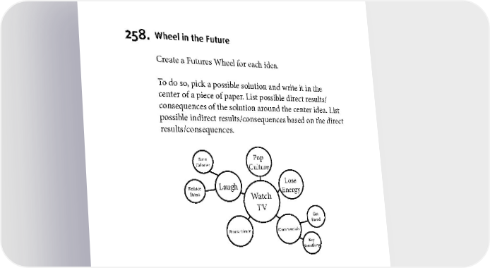 DECISION MAKING 258. Wheel in the Future Create a Futures Wheel for each idea. To do so, pick a possible solution and write it in the center of a piece of paper. List possible direct results/ consequences of the solution around the center idea. List possible indirect results/consequences based on the direct results/consequences. Burn Pop Calories Culture Lose Reduce Laugh Energy Stress Watch TV Get Bored Procrastinate Commercials Buy Something 134