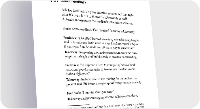 TRAINING 78. Solicit Feedback Ask for feedback on your training session, not just right 1 after it’s over, but 3 to 6 months afterwards as well. Actually incorporate the feedback into future sessions. Here’s some feedback I’ve received (and my takeaways): Feedback: “I felt like I learned something new with everything he said. He made my brain work in ways I had never used it before. It was crazy how he made everything so easy to understand.” Takeaway: Keep using interactive exercises to work the brain; keep them simple and build slowly to ensure understanding. Feedback: “To improve: Listen to examples of our real work issues and provide examples of how humor could be used to make a difference.” Takeaway: Include time in my training for the audience to present real–life issues and give specific ways humors can help. Feedback: “I love the shirts you wear.” Takeaway: Keep wearing my vibrant, solid–colored shirts. 1 Studies suggest people will have forgotten 78% of what they’ve learned after 78 days. To make sure the most important information truly stuck (the 22%), follow up again later. See Write It Down. 48
