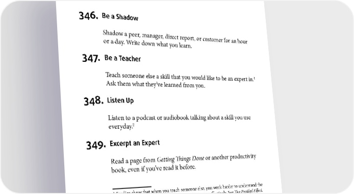 SKILL BUILDING 346. Be a Shadow Shadow a peer, manager, direct report, or customer for an hour or a day. Write down what you learn. 347. Be a Teacher 1 Teach someone else a skill that you would like to be an expert in. Ask them what they’ve learned from you. 348. Listen Up Listen to a podcast or audiobook talking about a skill you use everyday.2 349. Excerpt an Expert Read a page from Getting Things Done or another productivity book, even if you’ve read it before. 1 Studies show that when you teach someone else, you work harder to understand the material, recall it more accurately, and apply it more effectively. See The Protégé Effect. 2 Check out htww.co/podcasts for some recommendations. 179