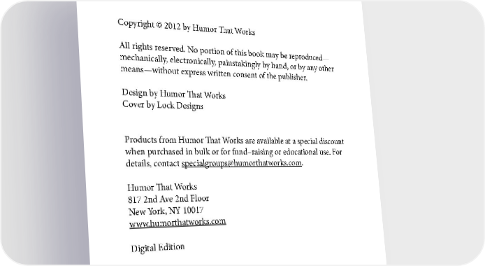 Copyright © 2012 by Humor That Works All rights reserved. No portion of this book may be reproduced— mechanically, electronically, painstakingly by hand, or by any other means—without express written consent of the publisher. Design by Humor That Works Cover by Lock Designs Products from Humor That Works are available at a special discount when purchased in bulk or for fund–raising or educational use. For details, contact specialgroups@humorthatworks.com. Humor That Works 817 2nd Ave 2nd Floor New York, NY 10017 www.humorthatworks.com Digital Edition