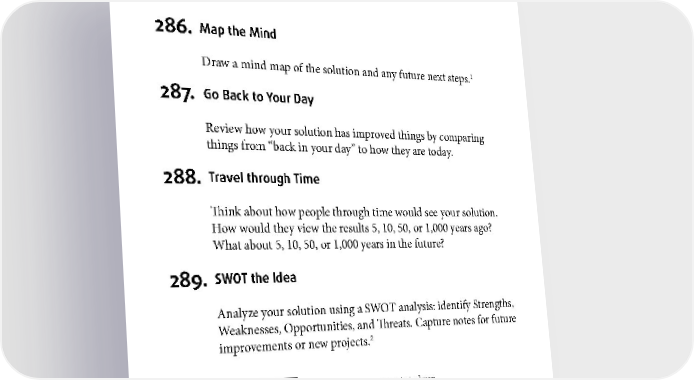 EVALUATION 286. Map the Mind Draw a mind map of the solution and any future next steps.1 287. Go Back to Your Day Review how your solution has improved things by comparing things from “back in your day” to how they are today. 288. Travel through Time Think about how people through time would see your solution. How would they view the results 5, 10, 50, or 1,000 years ago? What about 5, 10, 50, or 1,000 years in the future? 289. SWOT the Idea Analyze your solution using a SWOT analysis: identify Strengths, Weaknesses, Opportunities, and Threats. Capture notes for future 2 improvements or new projects. 1 Find out more about mind mapping at htww.co/mindmap. 2 Wearing SWAT gear like body armor and helmets is optional but loads of fun. 149