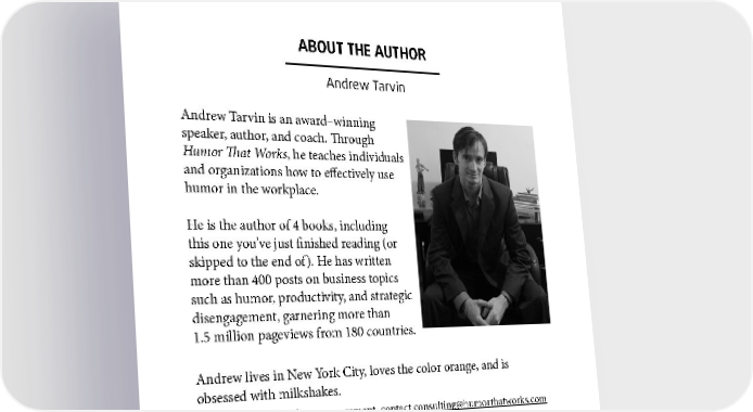ABOUT THE AUTHOR Andrew Tarvin Andrew Tarvin is an award–winning speaker, author, and coach. Through Humor That Works, he teaches individuals and organizations how to effectively use humor in the workplace. He is the author of 4 books, including this one you’ve just finished reading (or skipped to the end of). He has written more than 400 posts on business topics such as humor, productivity, and strategic disengagement, garnering more than 1.5 million pageviews from 180 countries. Andrew lives in New York City, loves the color orange, and is obsessed with milkshakes. To book Andrew for an engagement, contact consulting@humorthatworks.com or call 646-543-7398. 253