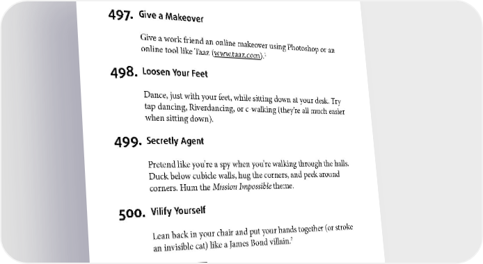 PLAY 497. Give a Makeover Give a work friend an online makeover using Photoshop or an 1 online tool like Taaz (www.taaz.com). 498. Loosen Your Feet Dance, just with your feet, while sitting down at your desk. Try tap dancing, Riverdancing, or c-walking (they’re all much easier when sitting down). 499. Secretly Agent Pretend like you’re a spy when you’re walking through the halls. Duck below cubicle walls, hug the corners, and peek around corners. Hum the Mission Impossible theme. 500. Vilify Yourself Lean back in your chair and put your hands together (or stroke 2 an invisible cat) like a James Bond villain. 1 Yes, even if the person is a man. 2 Chuckling to yourself is optional. Maniacal laughter may cause some suspicion. 250