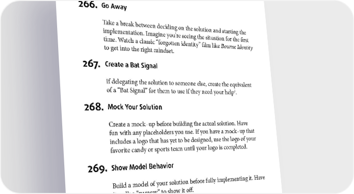 IMPLEMENTATION 266. Go Away Take a break between deciding on the solution and starting the implementation. Imagine you’re seeing the situation for the first time. Watch a classic “forgotten identity” film like Bourne Identity to get into the right mindset. 267. Create a Bat Signal If delegating the solution to someone else, create the equivalent of a “Bat Signal” for them to use if they need your help1. 268. Mock Your Solution Create a mock–up before building the actual solution. Have fun with any placeholders you use. If you have a mock–up that includes a logo that has yet to be designed, use the logo of your favorite candy or sports team until your logo is completed. 269. Show Model Behavior Build a model of your solution before fully implementing it. Have it walk a “runway” to show it off. 1 It could be as simple as a set email header or as cool as lighted sign. 140