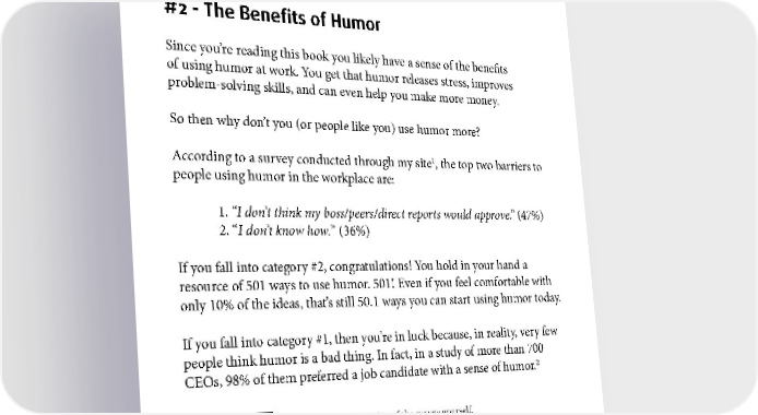 HUMOR THAT WORKS #2 - The Benefits of Humor Since you’re reading this book you likely have a sense of the benefits of using humor at work. You get that humor releases stress, improves problem-solving skills, and can even help you make more money. So then why don’t you (or people like you) use humor more? 1 According to a survey conducted through my site , the top two barriers to people using humor in the workplace are: 1. “I don’t think my boss/peers/direct reports would approve.” (47%) 2. “I don’t know how.” (36%) If you fall into category #2, congratulations! You hold in your hand a resource of 501 ways to use humor. 501! Even if you feel comfortable with only 10% of the ideas, that’s still 50.1 ways you can start using humor today. If you fall into category #1, then you’re in luck because, in reality, very few people think humor is a bad thing. In fact, in a study of more than 700 2 CEOs, 98% of them preferred a job candidate with a sense of humor. 1 Visit htww.co/survey to take the newest version of the survey yourself. 2 See Humor in the Workplace. 4
