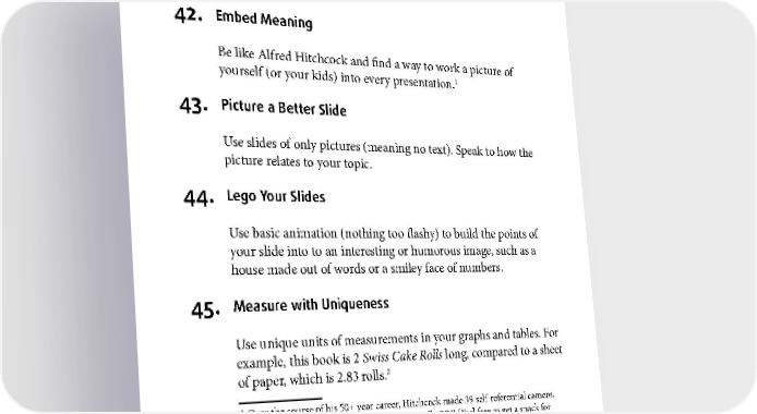 PRESENTATIONS 42. Embed Meaning Be like Alfred Hitchcock and find a way to work a picture of 1 yourself (or your kids) into every presentation. 43. Picture a Better Slide Use slides of only pictures (meaning no text). Speak to how the picture relates to your topic. 44. Lego Your Slides Use basic animation (nothing too flashy) to build the points of your slide into to an interesting or humorous image, such as a house made out of words or a smiley face of numbers. 45. Measure with Uniqueness Use unique units of measurements in your graphs and tables. For example, this book is 2 Swiss Cake Rolls long, compared to a sheet 2 of paper, which is 2.83 rolls. 1 Over the course of his 50+ year career, Hitchcock made 39 self-referential cameos. 2 Great, now I have a craving for Swiss Cake Rolls. BRB (Feel free to get a snack for yourself, too.) 35