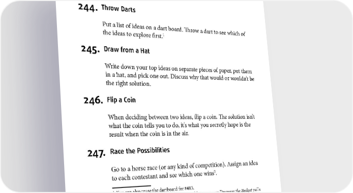DECISION MAKING 244. Throw Darts Put a list of ideas on a dart board. Throw a dart to see which of the ideas to explore first.1 245. Draw from a Hat Write down your top ideas on separate pieces of paper, put them in a hat, and pick one out. Discuss why that would or wouldn’t be the right solution. 246. Flip a Coin When deciding between two ideas, flip a coin. The solution isn’t what the coin tells you to do, it’s what you secretly hope is the result when the coin is in the air. 247. Race the Possibilities Go to a horse race (or any kind of competition). Assign an idea 2 to each contestant and see which one wins . 1 You can also reuse the dartboard for #483. 2 Your possible solutions also make for good horse names: “Increase the Budget pulls into the lead; he’s followed closely by Cut Scope. Do Nothing is bringing up the rear.” 129
