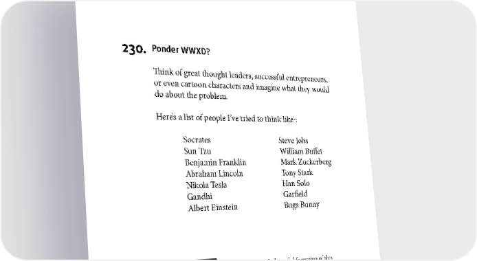 BRAINSTORMING 230. Ponder WWXD? Think of great thought leaders, successful entrepreneurs, or even cartoon characters and imagine what they would do about the problem. 1 Here’s a list of people I’ve tried to think like : Socrates Steve Jobs Sun Tzu William Buffet Benjamin Franklin Mark Zuckerberg Abraham Lincoln Tony Stark Nikola Tesla Han Solo Gandhi Garfield Albert Einstein Bugs Bunny 1 Note: You don’t have to like or agree with the real–life version of this person, just think about how they might go about solving your problem. 123