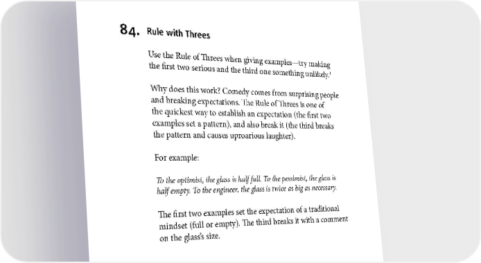 DOCUMENTS 84. Rule with Threes Use the Rule of Threes when giving examples—try making 1 the first two serious and the third one something unlikely. Why does this work? Comedy comes from surprising people and breaking expectations. The Rule of Threes is one of the quickest way to establish an expectation (the first two examples set a pattern), and also break it (the third breaks the pattern and causes uproarious laughter). For example: To the optimist, the glass is half full. To the pessimist, the glass is half empty. To the engineer, the glass is twice as big as necessary. The first two examples set the expectation of a traditional mindset (full or empty). The third breaks it with a comment on the glass’s size. 1 For a business-like example, review the definition of humor on page 2. 52