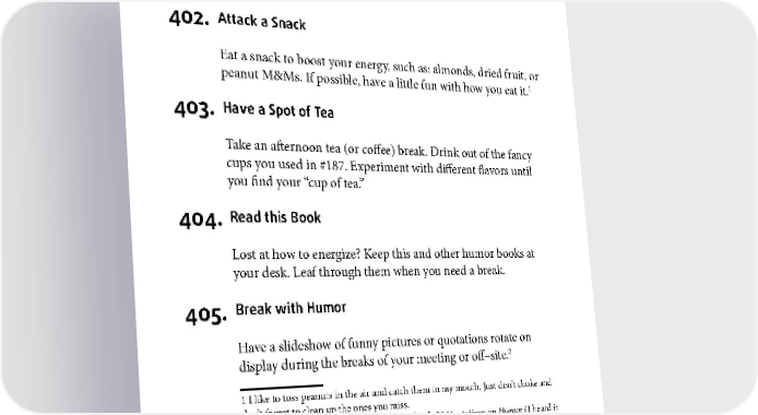 ENERGIZER 402. Attack a Snack Eat a snack to boost your energy, such as: almonds, dried fruit, or peanut M&Ms. If possible, have a little fun with how you eat it.1 403. Have a Spot of Tea Take an afternoon tea (or coffee) break. Drink out of the fancy cups you used in #187. Experiment with different flavors until you find your “cup of tea.” 404. Read this Book Lost at how to energize? Keep this and other humor books at your desk. Leaf through them when you need a break. 405. Break with Humor Have a slideshow of funny pictures or quotations rotate on 2 display during the breaks of your meeting or off–site. 1 I like to toss peanuts in the air and catch them in my mouth. Just don’t choke and don’t forget to clean up the ones you miss. 2 For some great quotations, check out the book 50 Quotations on Humor (I heard it was written by an awesome gentleman) or visit humorsoffice.com. 208
