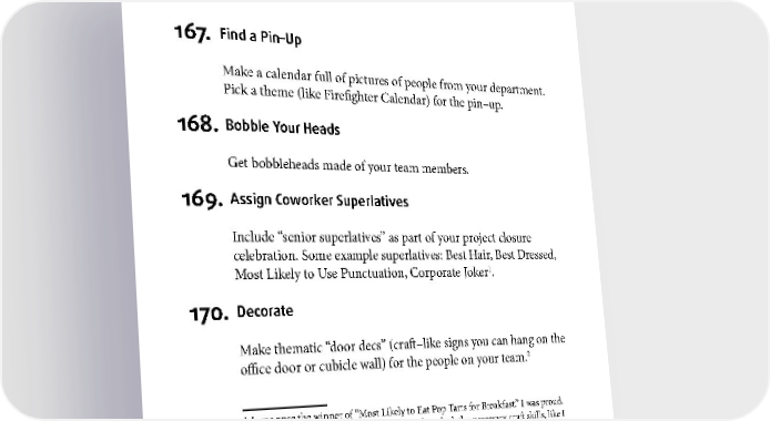 TEAM BUILDING 167. Find a Pin–Up Make a calendar full of pictures of people from your department. Pick a theme (like Firefighter Calendar) for the pin–up. 168. Bobble Your Heads Get bobbleheads made of your team members. 169. Assign Coworker Superlatives Include “senior superlatives” as part of your project closure celebration. Some example superlatives: Best Hair, Best Dressed, 1 Most Likely to Use Punctuation, Corporate Joker . 170. Decorate Make thematic “door decs” (craft–like signs you can hang on the 2 office door or cubicle wall) for the people on your team. 1 I was once the winner of “Most Likely to Eat Pop Tarts for Breakfast.” I was proud. 2 This also comes from my time as an RA. If you lack the necessary craft skills, like I did, find someone who knows what they’re doing and barter for their services. 93