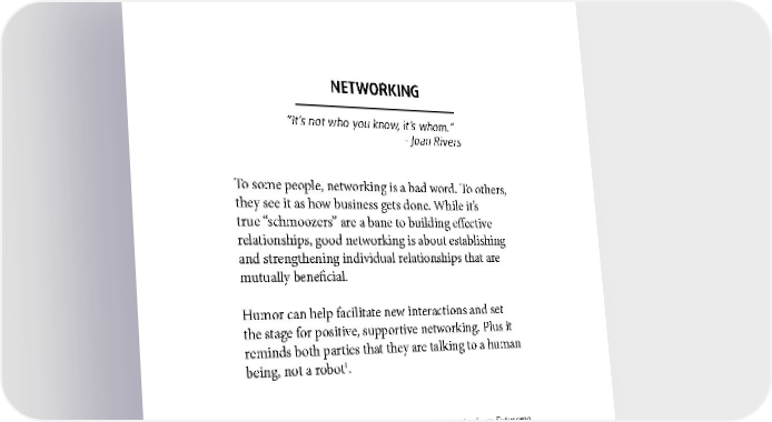 NETWORKING “It’s not who you know, it’s whom.” - Joan Rivers To some people, networking is a bad word. To others, they see it as how business gets done. While it’s true “schmoozers” are a bane to building effective relationships, good networking is about establishing and strengthening individual relationships that are mutually beneficial. Humor can help facilitate new interactions and set the stage for positive, supportive networking. Plus it reminds both parties that they are talking to a human being, not a robot1. 1 Robots rarely have a sense of humor, unless it’s Bender from Futurama. 70