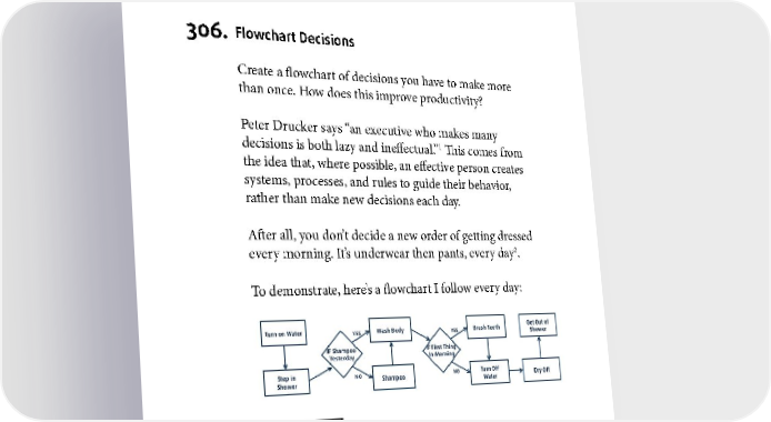 PLANNING 306. Flowchart Decisions Create a flowchart of decisions you have to make more than once. How does this improve productivity? Peter Drucker says “an executive who makes many 1 decisions is both lazy and ineffectual.” This comes from the idea that, where possible, an effective person creates systems, processes, and rules to guide their behavior, rather than make new decisions each day. After all, you don’t decide a new order of getting dressed 2 every morning. It’s underwear then pants, every day . To demonstrate, here’s a flowchart I follow every day: 1 See The Effective Executive. 2 Unless you’re Superman. 161