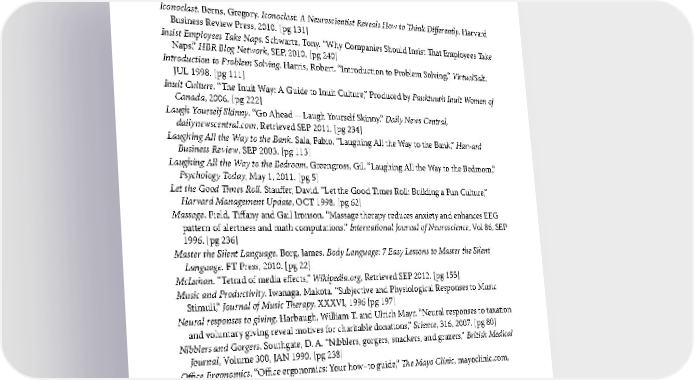 SOURCES Iconoclast. Berns, Gregory. Iconoclast: A Neuroscientist Reveals How to Think Differently. Harvard Business Review Press, 2010. [pg 131] Insist Employees Take Naps. Schwartz, Tony. “Why Companies Should Insist That Employees Take Naps,” HBR Blog Network, SEP, 2010. [pg 240] Introduction to Problem Solving. Harris, Robert. “Introduction to Problem Solving,” VirtualSalt. JUL 1998. [pg 111] Inuit Culture. “The Inuit Way: A Guide to Inuit Culture,” Produced by Pauktuutit Inuit Women of Canada, 2006. [pg 222] Laugh Yourself Skinny. “Go Ahead -- Laugh Yourself Skinny,” Daily News Central, dailynewscentral.com, Retrieved SEP 2011. [pg 234] Laughing All the Way to the Bank. Sala, Fabio. “Laughing All the Way to the Bank,” Harvard Business Review, SEP 2003. [pg 113] Laughing All the Way to the Bedroom. Greengross, Gil. “Laughing All the Way to the Bedroom,” Psychology Today, May 1, 2011. [pg 5] Let the Good Times Roll. Stauffer, David. “Let the Good Times Roll: Building a Fun Culture,” Harvard Management Update, OCT 1998. [pg 62] Massage. Field, Tiffany and Gail Ironson. “Massage therapy reduces anxiety and enhances EEG pattern of alertness and math computations.” International Journal of Neuroscience, Vol 86, SEP 1996. [pg 236] Master the Silent Language. Borg, James. Body Language: 7 Easy Lessons to Master the Silent Language. FT Press, 2010. [pg 22] McLuhan. “Tetrad of media effects,” Wikipedia.org, Retrieved SEP 2012. [pg 155] Music and Productivity. Iwanaga, Makota. “Subjective and Physiological Responses to Music Stimuli,” Journal of Music Therapy, XXXVI, 1996 [pg 197] Neural responses to giving. Harbaugh, William T. and Ulrich Mayr. “Neural responses to taxation and voluntary giving reveal motives for charitable donations,” Science, 316, 2007. [pg 80] Nibblers and Gorgers. Southgate, D. A. “Nibblers, gorgers, snackers, and grazers,” British Medical Journal, Volume 300, JAN 1990. [pg 238] Office Ergonomics. “Office ergonomics: Your how–to guide,” The Mayo Clinic, mayoclinic.com, Retrieved SEP 2012. [pg 193] 259