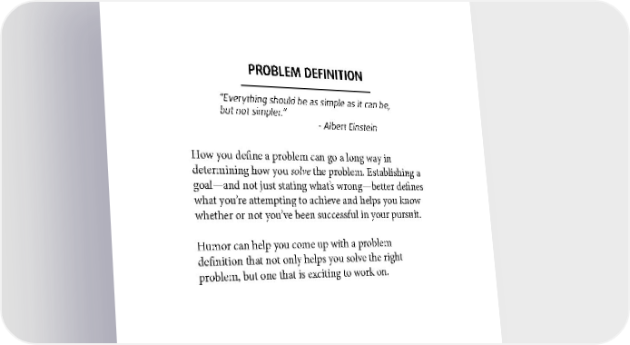 PROBLEM DEFINITION “Everything should be as simple as it can be, but not simpler.” - Albert Einstein How you define a problem can go a long way in determining how you solve the problem. Establishing a goal—and not just stating what’s wrong—better defines what you’re attempting to achieve and helps you know whether or not you’ve been successful in your pursuit. Humor can help you come up with a problem definition that not only helps you solve the right problem, but one that is exciting to work on. 110